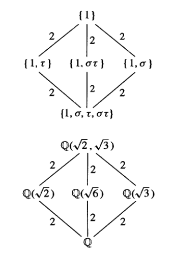 מה הולך כאן? אין צורך להיכנס לפרטים; הנקודה היא שהדיאגרמה העליונה היא של חבורה ותת החבורות שלה; והדיאגרמה התחתונה היא של הרחבת שדות וכל שדות הביניים שם, כשקווים מציינים את כל ההכלות. כפי שהתמונה מראה, המבנה של החבורה והמבנה של ההרחבה הם זהים. זה הפאנץ' הראשון, אבל יש עוד פאנצ'ים. ראשית, ההתאמה בין כל חבורה תת חבורה ובין כל שדה ביניים אינה מקרית: אם \(K\) הוא שדה ביניים של ההרחבה (כלומר \(F\subseteq K\subseteq E\)), אז תת החבורה שמתאימה לו היא אוסף כל האוטומורפיזמים של \(E\) שמשמרים אותו (וכך ל-\(F\) מתאימה החבורה כולה, כי מראש חבורת הגלואה מכילה רק אוטומורפיזמים שמשמרים את \(F\); ול-\(E\) מתאימה תת החבורה הטריוויאלית שמכילה רק את אוטומורפיזם הזהות, כי כל אוטומורפיזם אחר של \(E\) לא משמר אותו). בכיוון השני, אם נתונה תת חבורה כלשהי \(H\) של חבורת הגלואה \(G\), אז שדה הביניים שמתאים לה הוא תת השדה של \(E\) שמשתמר על ידי כל אברי \(H\) (צריך להראות שאוסף כל האיברים שמשתמרים תחת כל האוטומורפיזמים של \(H\) הוא שדה, אך זה לא קשה).