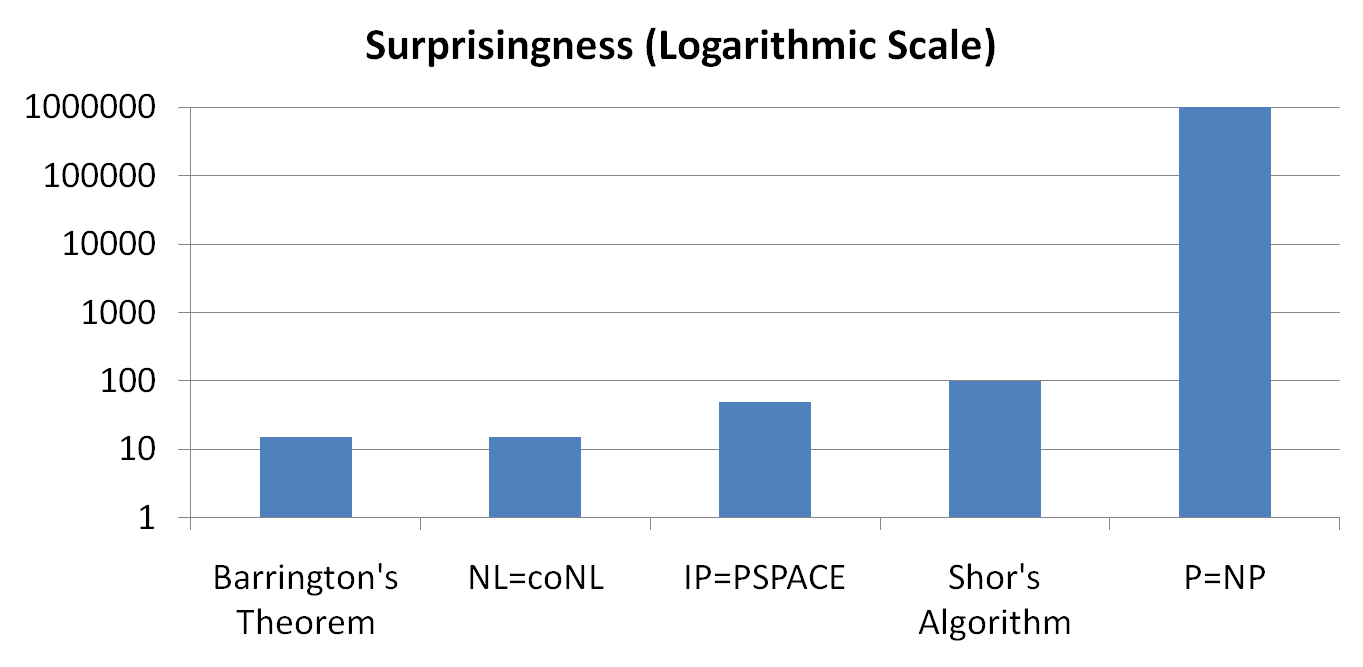 שימו לב לסקלה הלוגריתמית! אותה סקלה שבה משתמשים, למשל, במדידת רעידות אדמה. אם אינכם מכירים את התוצאות שמשמאל ל-P=NP, לא נורא - כולן תוצאות מפתיעות ומרתקות בתורת הסיבוכיות (למשל, האלגוריתם של שור הוא אלגוריתם יעיל לפירוק לגורמים במודל המחשב הקוונטי - אלגוריתם זה הקפיץ בצורה דרמטית את ההתעניינות בחישוב קוונטי). אם נמשיך בדוגמת רעידות האדמה - אם נפרש את הגרף כך שגם האלגוריתם של שור בסך הכל מתאים לרעידת אדמה קטנה ומסכנה, שבה בקושי שמים לב שאיזו כוס על השולחן בקומה 20 זזה טיפה לשנייה ואז מפסיקה - אז P=NP יתאים לרעידת אדמה שבה עיר מודרנית שלמה מתמוטטת וקורסת ונבלעת בלב האדמה. עד כדי כך יהיה מדובר על תוצאה מפתיעה.