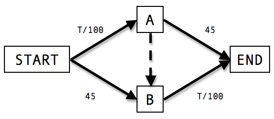 מה הולך כאן? נניח שהכניסה לחיפה היא נקודת ההתחלה, והקריות הן נקודת הסיום. מי שמגיע לחיפה צריך לבחור מה הוא מעדיף - לעלות על ההר בדרך פרויד המתפתלת, או לנסוע דרך העיר התחתית בכביש שמקיף את חיפה ומתארך עד אין קץ. הבה נניח את ההנחות (הלא ממש מציאותיות) הבאות: פרויד היא עליה מפותלת ובעייתית ותמיד לוקחת זמן רב - נניח, 45 דקות בין אם יש פקקים ובין אם אין (ממילא כולם נוסעים שם במהירות נמוכה). היא מסתיימת בנקודה שמסומנת ב-\(B\) בשרטוט, ואחרי שמגיעים לראש ההר עדיין צריכים לנסוע עד לצ'קפוסט. הנסיעה על ההר תלויה מאוד במצב התנועה - אם הכביש פנוי מרכבים אפשר לעבור אותה חיש קל - אפילו ב"0 דקות" (כמו שכבר הבנתם, המספרים פה שקריים לחלוטין - הרעיון הוא להתאים את עצמי לדוגמה). לעומת זאת ככל שמספר הרכבים שמנסים לנסוע דרך ההר גדל כך מספר הפקקים גדל באופן מחריד (החלק הזה דווקא מציאותי לגמרי...). התוצאה? אפשר להעריך שפרק הזמן שיקח לנהג לעבור את יתר הדרך על ההר הוא \(\frac{T}{100}\) דקות כאשר \(T\) הוא מספר הרכבים שמנסים לעבור דרך ההר בפרק הזמן הנוכחי. במילים אחרות, אם \(4500\) רכבים ינסו לעבור דרך ההר, גם קטע הדרך הזה יקח 45 דקות.