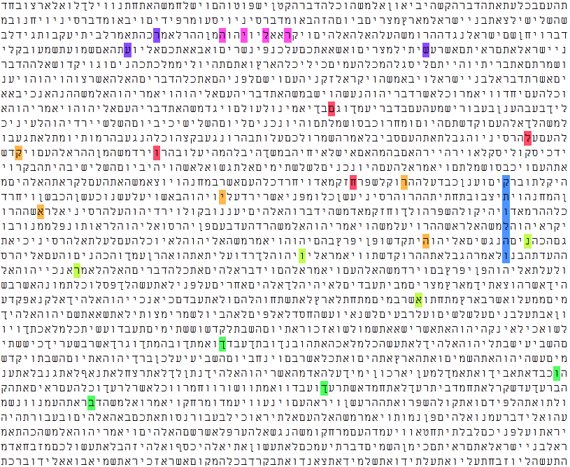 אם נציב \(N=300,000\) ו-\(\left|w\right|=8\) נקבל שתוחלת מספר המופעים של מילה כלשהי של 8 אותיות היא 0.2. כלומר, כל מילה מאורך 8 תופיע "חמישית פעם", ובניסוח אחר - אנחנו מצפים שבערך חמישית מהמילים מאורך 8 יופיעו. אם במקום 22 אותיות יש לנו רק 18, התוחלת קופצת ל-1. אם אנחנו מתעסקים עם מילה מאורך 7 (ו-22 אותיות) התוחלת היא 5 וקצת. מילה מאורך 4 כבר צפויה להופיע בסביבות ה-100,000 פעמים. זה אומר לנו שני דברים: ראשית, שמילים קצרות יחסית (עד 6 אותיות, נאמר) יופיעו כל כך הרבה פעמים שהתורה (וכל טקסט אחר) פשוט מוצף בהן, ואפשר יהיה למצוא אותן כמעט בכל מקום שנבחר; ושנית, שגם מילים ארוכות יותר יהיו בשפע. אמנם, אם נבחר מילה ארוכה קונקרטית יש סיכוי שהיא לא תופיע, למרבה צערנו; אבל אם נצליח לחשוב על רשימה של אלף מילים "מעניינות" מאורך 8, אפשר לצפות לכך שלפחות מאתיים מהן יופיעו, ועל כל מופע כזה אפשר יהיה לכתוב פרק בספר, אם נצליח למצוא "סביבו" עוד מופעים מעניינים של מילים (שלרוב יהיו מילים קצרות כי מילים קצרות אפשר למצוא בכל מקום). זו המתמטיקה שמאחורי מציאת "ביטויים מעניינים קרובים זה לזה". הגורם הריבועי, \(N^{2}\), פחות או יותר מבטיח שבטקסטים ארוכים למדי ההסתברויות יקפצו לשמיים.