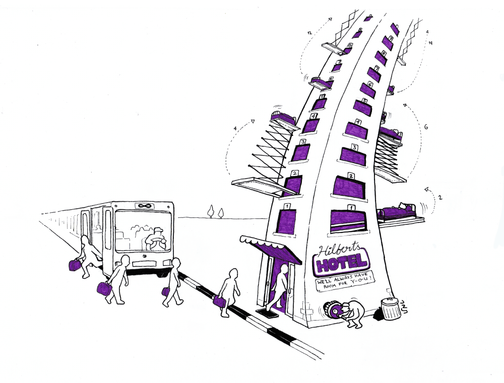 מה רואים כאן? את המלון של הילברט והאופן שבו משכנים בו אוטובוס עם אינסוף אורחים - מקפיצים (מילולית, אצל תמר) כל אורח קיים לחדר שמספרו פי 2 ממספר החדר הנוכחי שלו, ומכניסים את האורחים החדשים לכל החדרים האי זוגיים שהתפנו. במקרה הזה, תמונה אחת שווה \(\aleph_0\) מילים.
