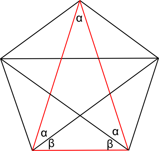 עכשיו, כל זווית של המחומש מחולקת על ידי הפנטגרמה לשלושה חלקים. שניים מהם בבירור זהים מטעמי סימטריה; בקשר לזווית האמצעית אנחנו קצת פחות בטוחים. בואו נסמן את הזוויות הצדדיות ב-\(\alpha\) ואת הזווית הפנימית ב-\(\beta\):