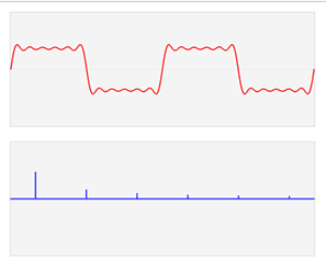 כאשר אנו מסכימים על כך שהסכום הוא רק על הערכים האי-זוגיים של \(n\). הסכום הזה לא נראה הכי נחמד בעולם, אבל אפשר לפשט אותו בקלות: \(-\frac{2i}{n\pi}=\frac{4}{\pi}\cdot\frac{1}{2i}\frac{1}{n}\). כמו כן, לכל \(n>0\) אי זוגי אפשר לחבר את האיבר השלילי המתאים לו ולקבל \(-\frac{2i}{n\pi}e^{inx}+\left(-\frac{2i}{-n\pi}e^{i-nx}\right)=-\frac{2i}{n\pi}\left(e^{inx}-e^{-inx}\right)=\frac{4}{\pi}\frac{e^{inx}-e^{-inx}}{2i}\frac{1}{n}=\frac{4}{\pi}\frac{\sin nx}{n}\)