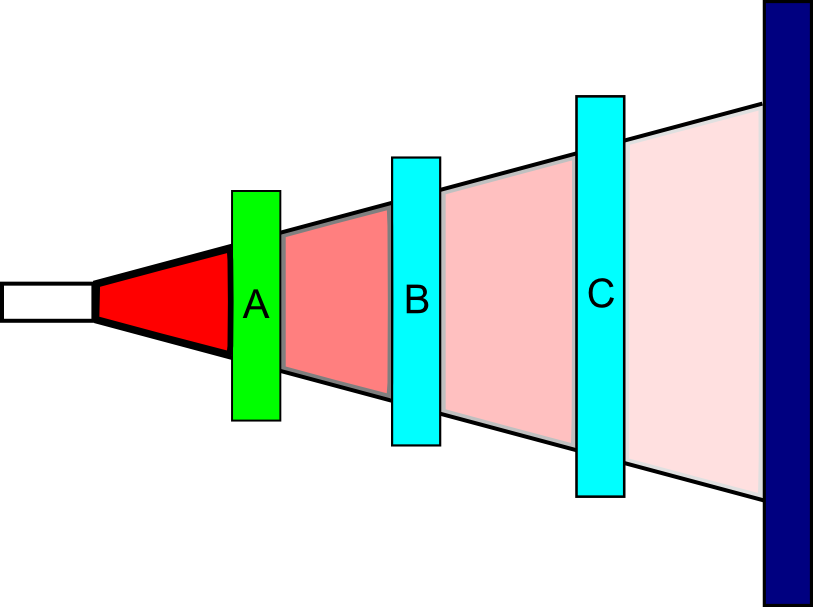 עד כאן, הגיוני. עכשיו ניקח פילטר B שזווית הקיטוב שלו היא ב-45 מעלות הן ל-A והן ל-C; נסמן אותה \(\nearrow\) אם נשים את B בין A ו-C, המצב ישתנה - פתאום כן נראה אור על המסך, בערך ב-\(\frac{1}{8}\) העוצמה של האור המקורי. כלומר - הוספה של עוד פילטר בין שני הקיימים דווקא הגבירה את עוצמת האור. מה קורה כאן?