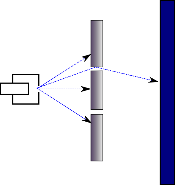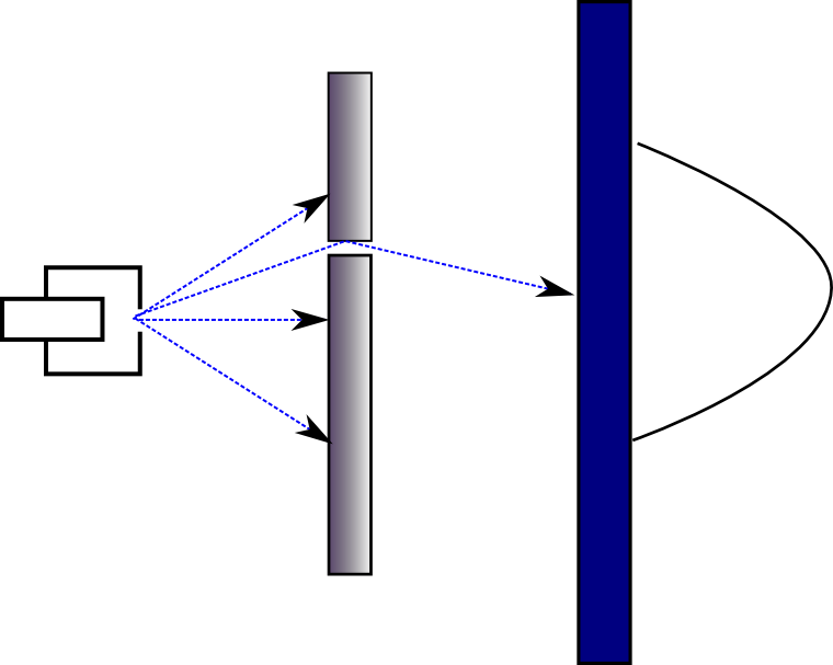 הניסוי הראשון נקרא "ניסוי שני הסדקים", והוא תואר על ידי ריצ'רד פיינמן בהרצאות שלו על תורת הקוונטים (הכרך השלישי בסדרת Feynman Lectures on Physics). הניסוי עצמו הוא ישן למדי - הוא הומצא במאה ה-19 בידי תומס יאנג - אבל פיינמן משתמש בוריאציה עליו כדי לסייע בתיאור עקרונות תורת הקוונטים. הרעיון הבסיסי הוא זה: יש לנו מקור ש"יורה" עוד ועוד אובייקטים מסוג כלשהו - בהתחלה פיינמן מדבר על קליעי רובה, אחר כך על גלי מים ובסופו של דבר על אלקטרונים - אל עבר קיר שיש בו שני סדקים שרק דרכם החלקיקים יכולים לעבור. מהצד השני של הקיר יש גלאי שמאפשר לנו לראות לאן החלקיקים הגיעו בסופו של דבר, ואנו מנסים לראות איזו תבנית נוצרת על הקיר. כך זה נראה באיור: