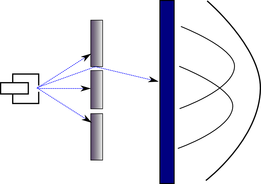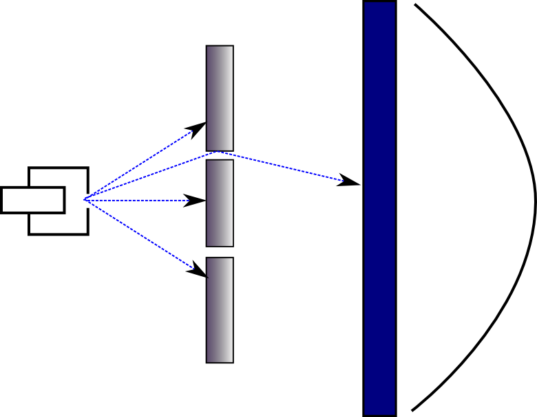 המשהו המופרע הזה הוא בדיוק התבנית של ההתאבכות שתיארתי קודם מבחינה מתמטית - אנחנו רואים שעוצמת הגלים המתאבכים מאוד חזקה באמצע (לא במקרה; מטעמי סימטריה די ברור שהפרש הפאזות יהיה אפס) ואז נחלשת, ואז שוב מתחזקת אבל פחות, ואז שוב נחלשת וכן הלאה וכן הלאה.