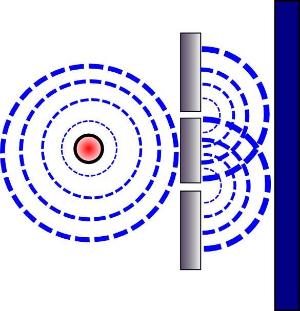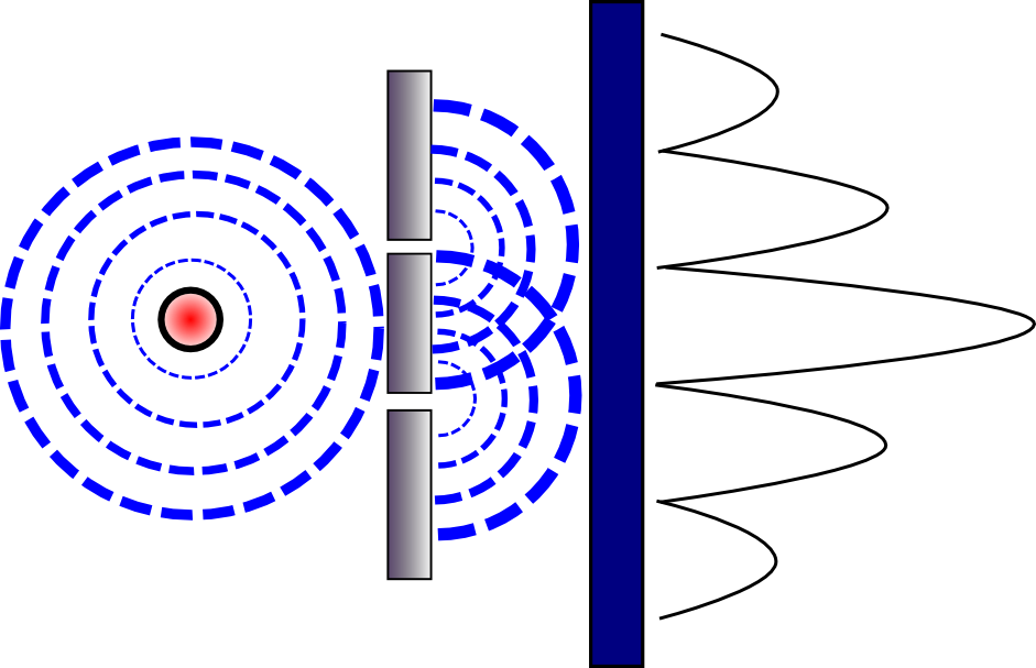 הגלאי שמצדו השני של המחסום כבר לא מודד פגיעות של קליעים, אלא את עוצמת הגל שמגיע אליו. עכשיו, אם נחסום את אחד מהסדקים ונסתכל על הגלאי, נראה שהגלאי מציג תבנית שדומה מאוד לזו של פגיעת הקליעים (עוצמת הגל נחלשת ככל שהולכים לצדדים כי ככל שהגל מתרחק, כך האנרגיה שלו מתפזרת על פני שטח גדול יותר ולכן העוצמה הנקודתית שלו נחלשת); אבל אם נפתח את שני הסדקים, נקבל משהו מופרע לגמרי: