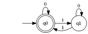 אם חושבים על זה קצת, רואים שהאלגוריתם יכול להיות באחד משני "מצבים" אפשריים - או ש-count שווה 0, או שהוא שווה 1. מה שקורה בכל צעד של האלגוריתם תלוי בתו הבא מהקלט שקראנו: אם קראנו 0 המצב שלנו לא משתנה; ואם קראנו 1 אנחנו עוברים מהמצב שלנו למצב השני. אנחנו מתחילים במצב של 0, והפלט שלנו אמור להיות "כן" רק אם גם סיימנו במצב של 0. את כל המידע הזה אפשר לקודד באיור באופן הבא: