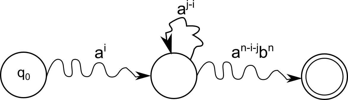 ראשית, לכל \(0\le k\le n\) נגדיר \(p^{k}=\delta\left(q_{0},a^{k}\right)\). מכיוון שהגדרנו \(n+1\) מצבים, לפחות אחד ממצבי האוטומט מתקבל פעמיים באופן הזה, כלומר יש \(i