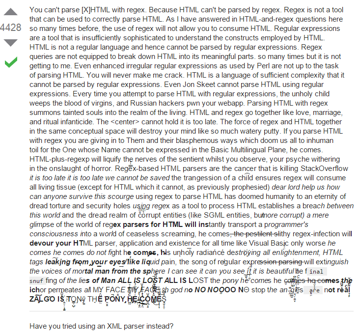 וזה כמובן שגוי. שוב, הבעיה היא שהביטוי הרגולרי שלנו לא "סופר" - הוא לא יודע מתי כמות ה-<div/> שהוא ראה מתאזנת עם כמות ה-<div> שהוא ראה. בשל כך, ביטויים רגולריים הם לא משהו בשביל פרסור כללי של הטמל וצריך להשתמש בכלים חזקים יותר (שגם אליהם אגיע מתישהו בבלוג, בתקווה). ואם הגעתי לנקודה הזו, יש רק דרך אחת לסיים. באתר השאלות והתשובות stackoverflow מישהו שאל פעם בדיוק על זה - פרסור הטמל עם ביטויים רגולריים. הוא קיבל "תשובה" שאמנם קשה לומר שהיא תשובה מועילה יותר מדי, אבל היא אחד מהדברים המשעשעים ביותר שקשורים לביטויים רגולריים שאני מכיר (הו, יש המון! בדיחות ביטויים רגולריים זה אדיר!). היא כל כך מוצלחת שאני לא רק מקשר אליה אלא שם צילום מסך, שיהיה לתמיד (ולא, שום דבר לא מקולקל בצילום המסך או במחשב שלכם, כל הפונטים שם הם בכוונה):