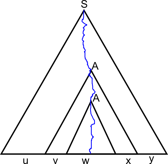 זה מסביר את המבנה ה"מוזר" של הפירוק. בואו נגיד במילים מה הם שלושת הדברים הללו: יש בדקדוק משתנה \(A\) שגוזר את עצמו, ואותו המשתנה ניתן לגזירה מתוך \(S\), ובנוסף הוא יודע לגזור מילה טרמינלית. כאשר גוזרים אותו מתוך \(S\) נסמן ב-\(u,y\) את "מה שמתפזר לצדדים", ובאופן דומה כאשר \(A\) גוזר את עצמו נסמן ב-\(v,x\) את "מה שמתפזר לצדדים", וב-\(w\) אנחנו מסמנים את המילה הטרמינלית שאנחנו יודעים שהוא יודע לגזור. אם הראינו את שלושת הדברים הללו, ברור שאפשר לייצר את \(uv^{i}wx^{i}z\) לכל \(i\ge0\): על ידי ביצוע הגזירה \(S\Rightarrow^{*}uAy\), הפעלה \(i\) פעמים של הגזירה \(A\Rightarrow^{*}vAx\) ולבסוף הפעלה אחת של \(A\Rightarrow^{*}w\).