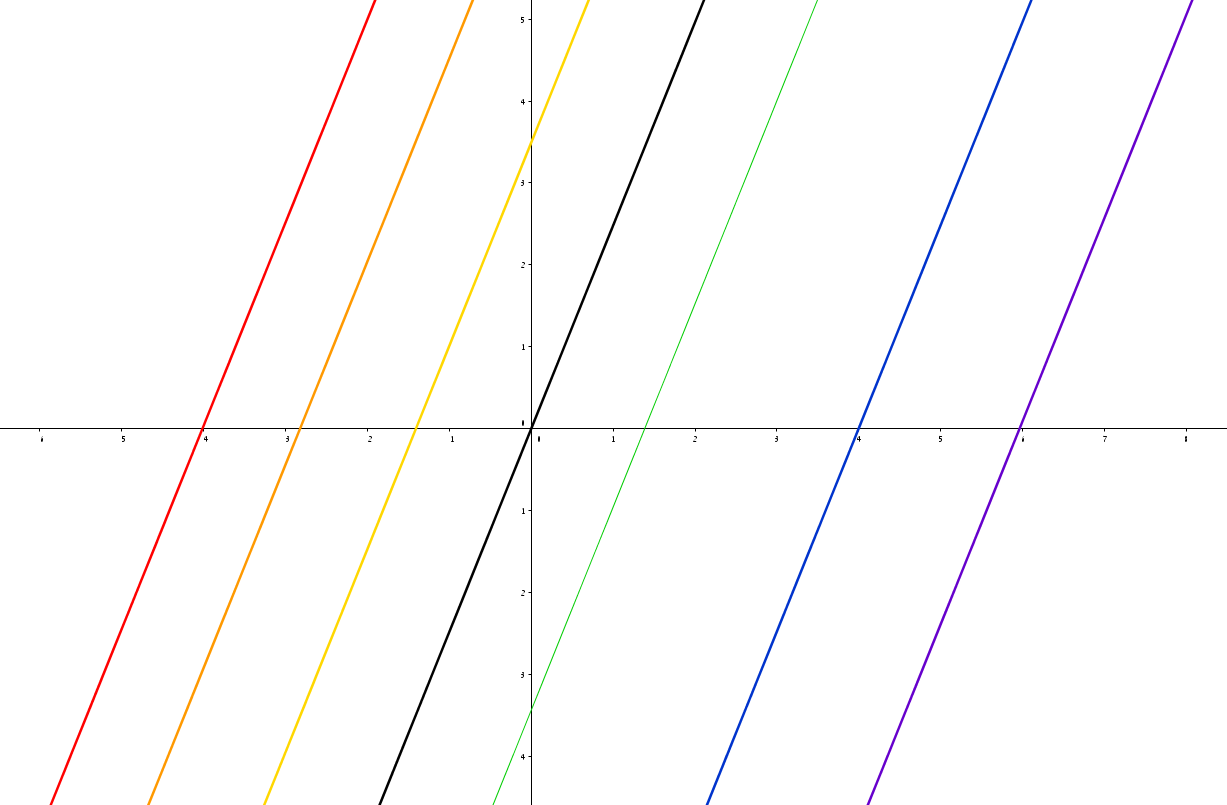 שאר הקוסטים של \(H\) הם שאר הישרים האופקיים, והשאלה עכשיו היא מה קורה עם תת-חבורות דומות אחרות. למשל, \(H=\left\{ \left(a,a\right)\ |\ \left(a\in\mathbb{R}\right)\right\} \). זה תרגיל נחמד להראות שקוסט כאן הוא תמיד מהצורה \(H+\left(x,0\right)=\left\{ \left(a+x,a\right)\ |\ a\in\mathbb{R}\right\} \) ויוצא שקוסט כזה הוא קו ישר עם שיפוע של 45 מעלות, כמו \(H\) עצמה, אבל שנקודת החיתוך שלו עם ציר \(x\) היא שונה מ-\(\left(0,0\right)\). זה גם מה שיקרה באופן כללי: כל ישר שעובר דרך הראשית הוא תת-חבורה של \(\mathbb{R}^{2}\), ולכל ישר כזה, הקוסטים הם כל הישרים המקבילים לו. הנה איור: