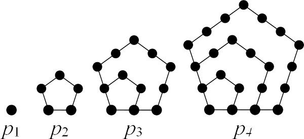 ראשית, מה זה מספר מחומש? זה מספר מהצורה \(\frac{k\left(3k-1\right)}{2}\) כאשר \(k\) הוא מספר טבעי חיובי. השם "מספר מחומש" מגיע מכך שצורה מוזרה שבה אפשר לקבל את המספרים היא לצייר סדרה של \(k\) מחומשים אחד בתוך השני, כשבמחומש ה-\(k\) יש בדיוק \(k\) נקודות על כל צלע, ואז לספור כמה נקודות יש בסך הכל. המחומש הראשון, זה עם נקודה אחת על כל צלע, הוא "מנוון" ונראה כמו נקודה בודדת: