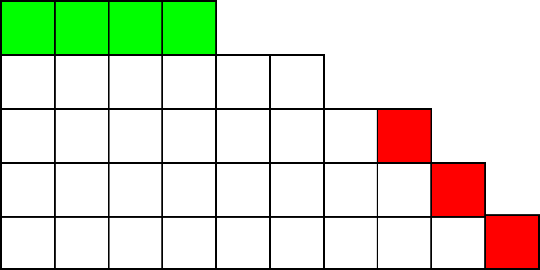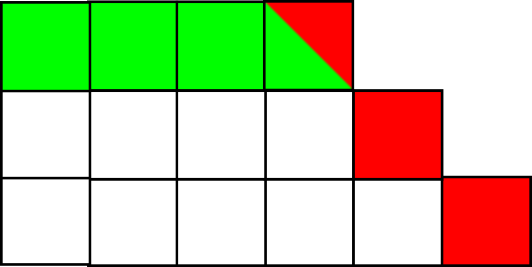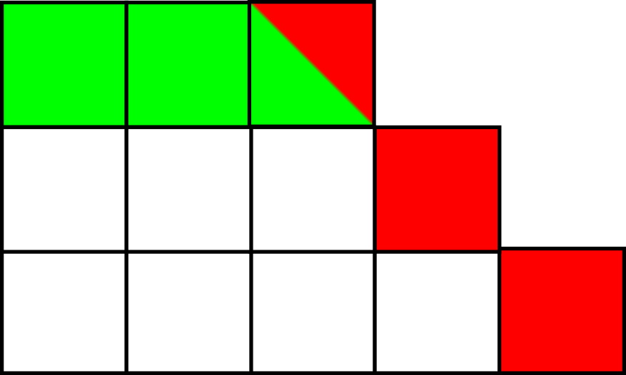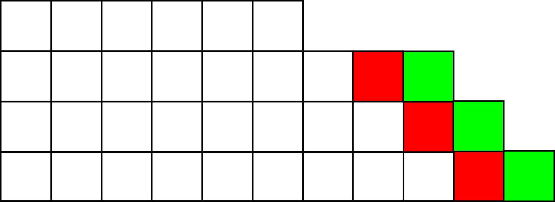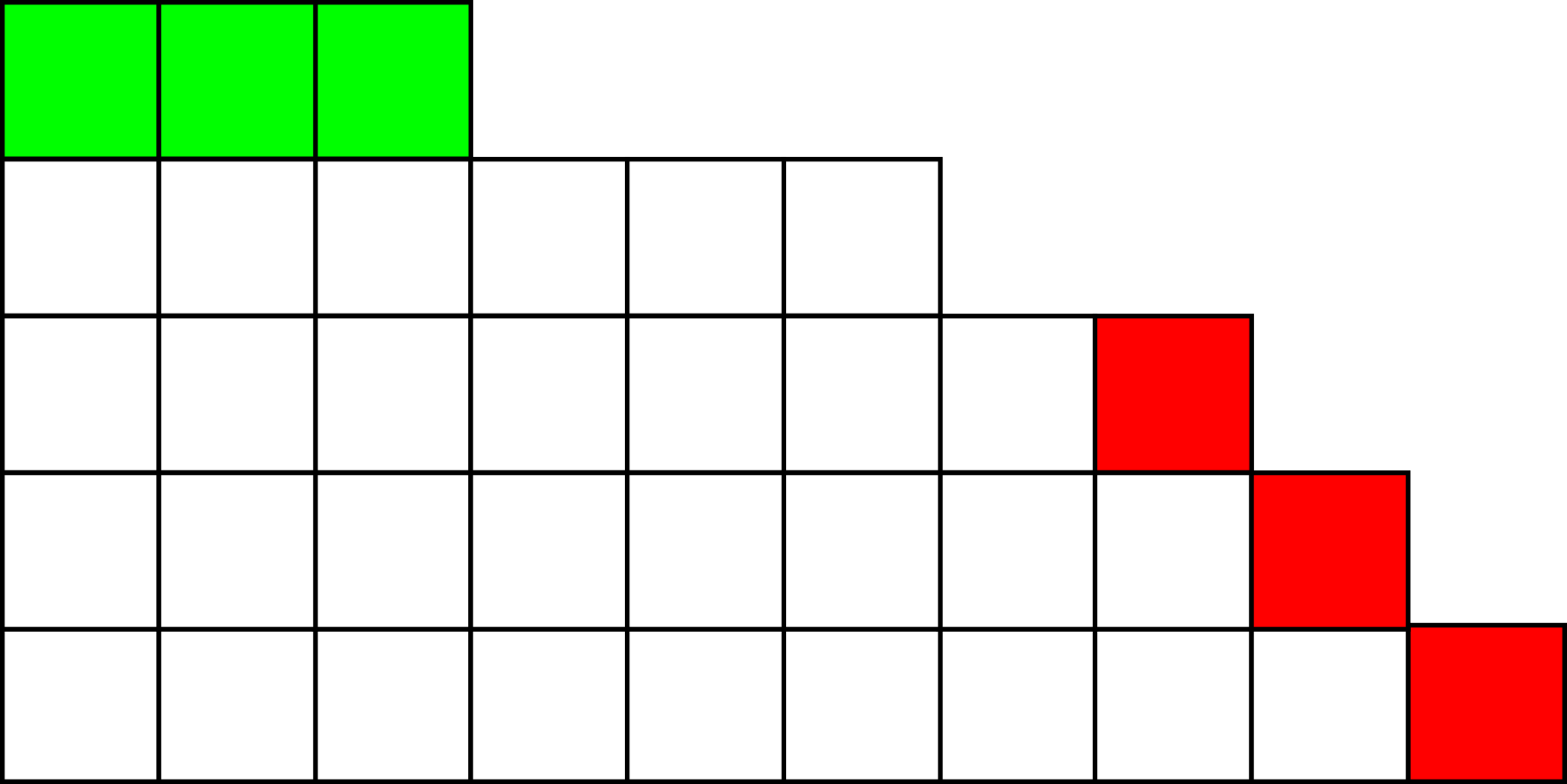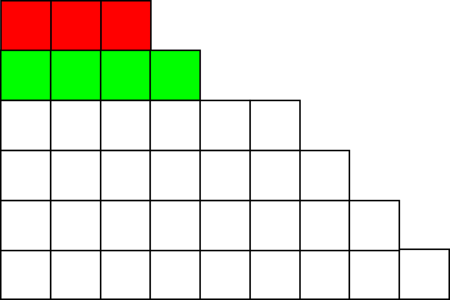 אנחנו רוצים לבנות מהטבלה הזו טבלה שמייצגת מספר שונה ב-1 של מחוברים. כל מחובר מתאים לשורה בטבלת היאנג, כך ששתי דרכי הפעולה הטבעיות ביותר הן: או להוסיף שורה מעל השורה העליונה, שתיבנה מקוביות שניקח מהשורות האחרות; או להסיר את השורה העליונה ולחלק אותה לשורות האחרות. ואנחנו רוצים שהכלל שמכתיב לנו באיזו משתי הדרכים כדאי לנקוט יהיה כזה ש"הופך את עצמו" אחרי שימוש אחד. אז הנה הטריק: בואו נמספר ב-\(r\) את מספר הקוביות בשורה העליונה ("המחובר הקטן ביותר בסכום") וב-\(s\) נמספר את האורך של האלכסון בצד ימין למטה של הטבלה. באיור אצבע את השורה העליונה בירוק ואת האלכסון באדום: