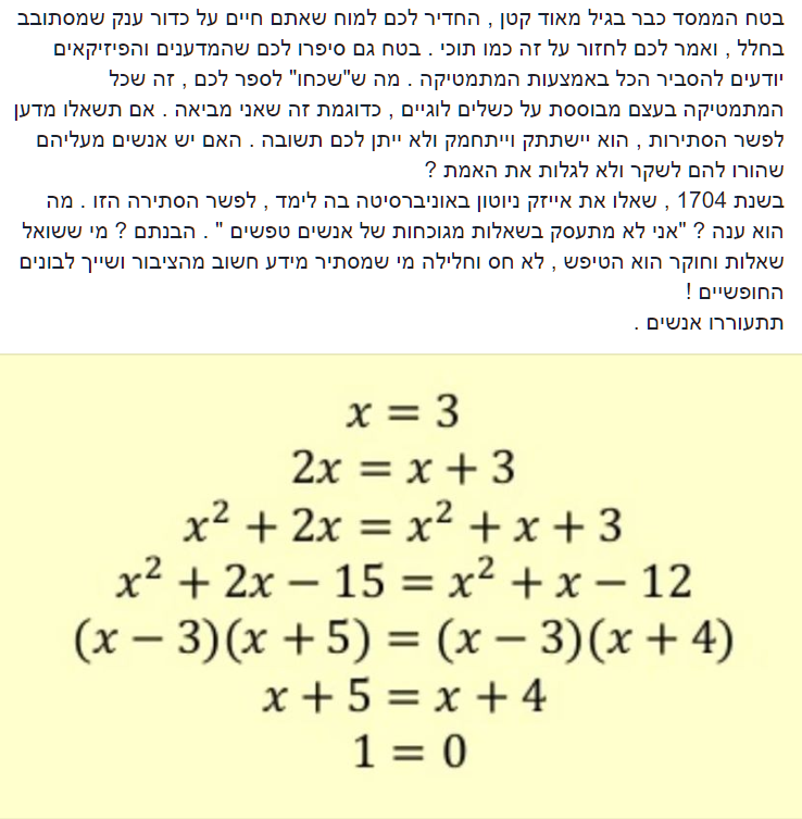 עוד נקודה שאני רוצה לחדד טיפה היא שזה לא אסון אם מקבלים \(1=0\). זה לא בהכרח אומר שהגענו לסתירה במתמטיקה, אלא שהגענו למשהו שנראה כמו סתירה להנחות שלנו ולכן קרוב לודאי שאחת מהן לא נכונה. הרי את ה"תרגיל" למעלה היה אפשר להתחיל מהשורה הלפני אחרונה: