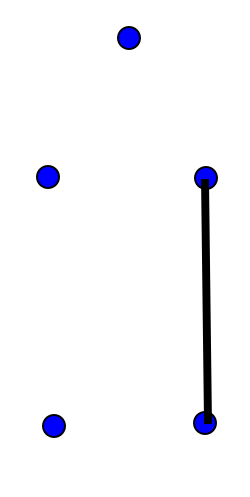 כרגע \(E=4\) (כמספר הצמתים פחות אחד - לא מקרי, כמובן, הקשר \(E=V-1\) מתקיים בכל עץ) ו-\(F=1\). כלומר, כבר כרגע מתקיימת הנוסחה \(V-E+F=2\), וזה לא מפתיע כי הגרף שקיבלנו כרגע הוא גם מישורי וגם קשיר (זוכרות? קשירות הייתה הכרחית בשביל נוסחת אוילר, בדיוק בגלל שצמתים מבודדים כמו בתמונות הקודמות לא משפיעים על \(E\) ועל \(F\) ואפשר להוסיף כמה מהם שרוצים). מה שיקרה מכאן ואילך הוא שכל צעד ישמר את הקשר הזה, \(V-E+F=2\); כי כל צעד גם יוסיף קשת אחת (יגדיל את \(E\) ב-1) וגם יצור פאה חדשה (יגדיל את \(F\) ב-1). בואו נראה את זה קורה בפעם הראשונה: