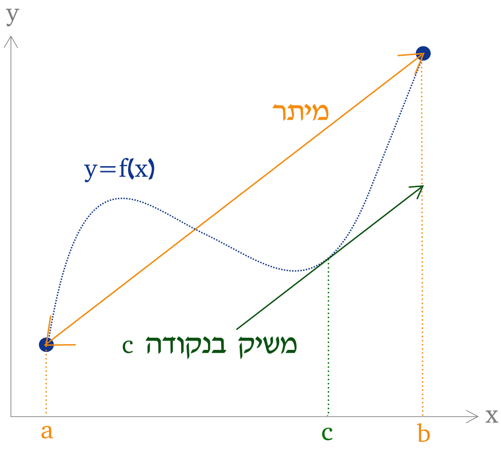 כלומר \(f^{\prime}\left(c\right)=\frac{f\left(b\right)-f\left(a\right)}{b-a}\) שזה בדיוק מה שרצינו. האינטואיציה פה שוב פשוטה ונובעת ממה שנקרא לינאריות הנגזרת, \(\left(f+g\right)^{\prime}=f^{\prime}+g^{\prime}\): מכיוון ש-\(g\) היא ההפרש בין \(f\) ובין המיתר, אז הנגזרת של \(g\) היא ההפרש בין הנגזרת של \(f\) ובין נגזרת המיתר, שהיא פשוט השיפוע הקבוע של המיתר. לכן יש נקודה שבה ההפרש הזה מתאפס, והנגזרת של \(f\) שווה בדיוק לשיפוע המיתר.