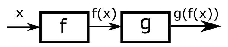 בסדרת הפוסטים שלי על תורת הקבוצות הכרנו יחסים והכרנו פונקציות. זה נותן לנו אבני לגו, וכידוע מה שעושים עם אבני לגו הוא לחבר אותן אחת לשניה. בהקשר של פונקציות המשמעות של חיבור שכזה היא פשוטה: אנחנו רוצים להפעיל פונקציה אחת על הפלט של הפונקציה השניה. כלומר, אם אני חושב על פונקציה בתור מין קופסה שחורה שכזו שיש לה צינור כניסה של "קלט" וצינור יציאה של "פלט", אז המשמעות של הרכבה של פונקציות היא לחבר את צינור הקלט של הפונקציה השניה לצינור הפלט של הפונקציה הראשונה, ככה: