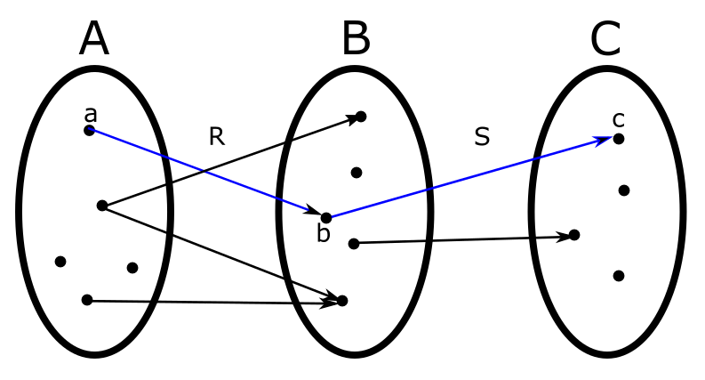 \(R\circ S\triangleq\left\{ \left(a,c\right)\ |\ \exists b\in B:\left(a,b\right)\in R\wedge\left(b,c\right)\in S\right\} \)