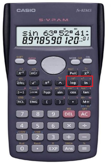 עכשיו, אם נסתכל שניה על מחשבון, נראה שאין בו הרבה כפתורים עבור לוגריתמים. אם יש לנו מזל יש אחד עבור \(\log\) ואחד עבור \(\ln\) וזהו זה.