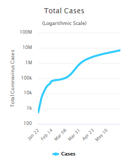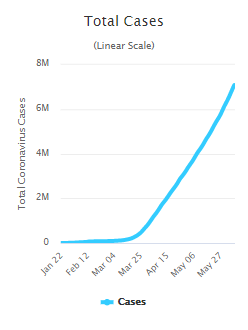 הבה ונסתכל בגרף של מספר מקרי הקורונה בעולם בין ינואר ליוני 2020: