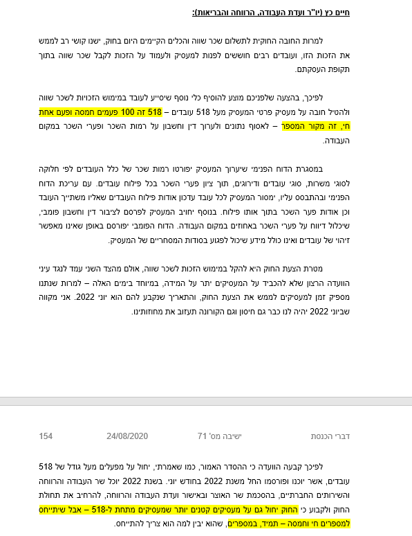 אני חושב שזה לא סוד שהמתמטיקה מתגנבת אלינו לעתים קרובות בדרכים מטופשות במיוחד. אחת מהדרכים הללו הייתה הישיבה השבעים-ואחת של הכנסת העשרים-ושלוש שהתקיימה בתאריך 24/8/2020. בישיבה הזו נידונה "הצעת חוק שכר שווה לעובדת ולעובד" ומי שעלה לנאום היה יו"ר ועדת העבודה, הרווחה והבריאות חיים כץ. החוק שעליו דיבר כץ עוסק בהטלת חובה על מעסיק פרטי לאסוף נתונים ולערוך דין וחשבון על רמות השכר ופערי השכר במקום העבודה; עד כאן טוב ויפה. אלא שההחלטה קבעה שהחובה הזו תוטל רק על מעסיק שמעסיק מעל 518 עובדים, וכאן עולה מאליה השאלה - מאיפה המספר הקסום הזה בא?