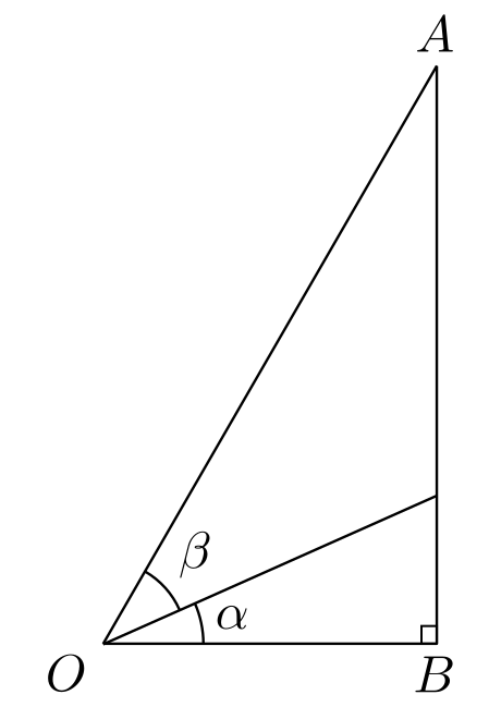 המשולש \(OAB\) הוא ישר זווית (ספציפית, \(\angle OBA=90^{\circ}\)). השימוש ב-\(O\) בתור אחד הקודקודים בא לרמז שאני מצייר את המשולש הזה על מעגל היחידה ש-\(O\) הוא המרכז שלו, ו-\(A\) היא הנקודה שעל המעגל עצמו; \(OA\) הוא היתר של המשולש ומכיוון שאני מתבסס על מעגל היחידה אני מניח ש-\(\left|OA\right|=1\). בהינתן אלו, \(\sin\left(\alpha+\beta\right)=\left|AB\right|\), כך שצריך לחשב את אורך הצלע \(AB\). לשם כך אני אעזר בקו שפיצל את הזווית במשולש לסכום \(\alpha+\beta\). הרעיון הוא לקחת את הקו הזה ולהמשיך אותו גם מעבר למשולש, עד שהוא יהיה ארוך מספיק כדי שאוכל להוריד אליו אנך מנקודה \(A\). ככה זה נראה: