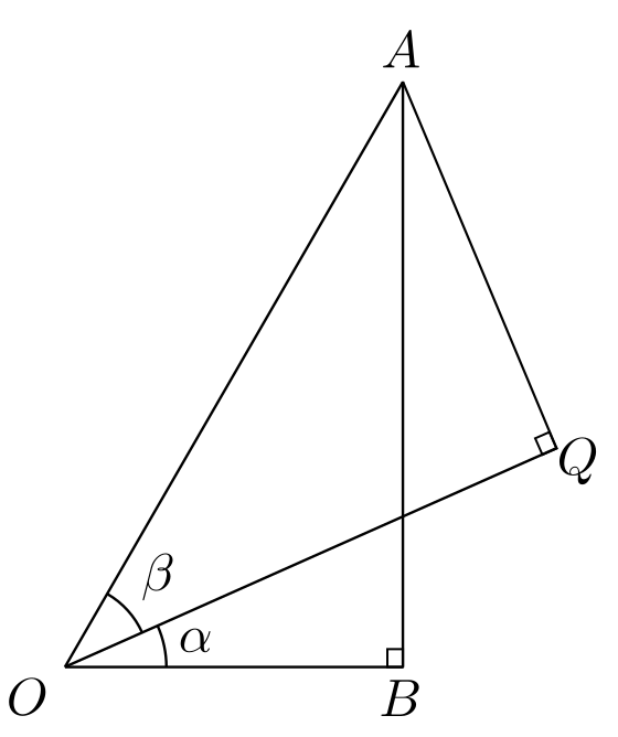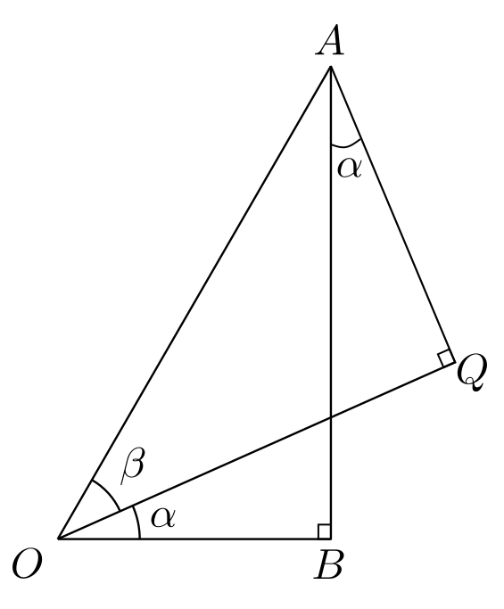 בואו נסתכל לרגע על המשולש \(OQA\) שקיבלנו. זה משולש ישר זווית, והיתר שלו הוא \(AO\) שכבר אמרתי שאני אוהב כי \(\left|AO\right|=1\). במילים אחרות, אחרי שהתחלנו עם משולש ישר זווית ש-\(AO\) הייתה היתר שלו, עכשיו בנינו עוד משולש ישר זווית ש-\(AO\) היא היתר שלו, אבל הזוויות שלו שונות: במקום שתהיה בו הזווית \(\alpha+\beta\) יש בו את הזווית \(\beta\) לבדה. בפרט, \(\left|AQ\right|=\sin\beta\) ו-\(\left|OQ\right|=\cos\beta\). זה מקדם אותנו משמעותית - אורכי שתי הצלעות הללו הן חצי מ"נתוני הבסיס" שאנחנו מצפים לקבל את התוצאה שלנו באמצעותם. רק צריך איכשהו להכניס את \(\alpha\) לתמונה גם כן.