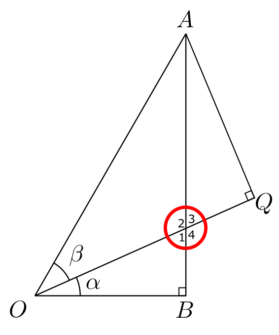 העניין הוא ש-\(\alpha\) כבר בתמונה ופשוט לא שמנו לב. בואו נסתכל לרגע על הנקודה שבה נחתכים \(AB\) ו-\(OQ\), שלא נתתי לה שם כדי לא לסרבל יותר מדי: