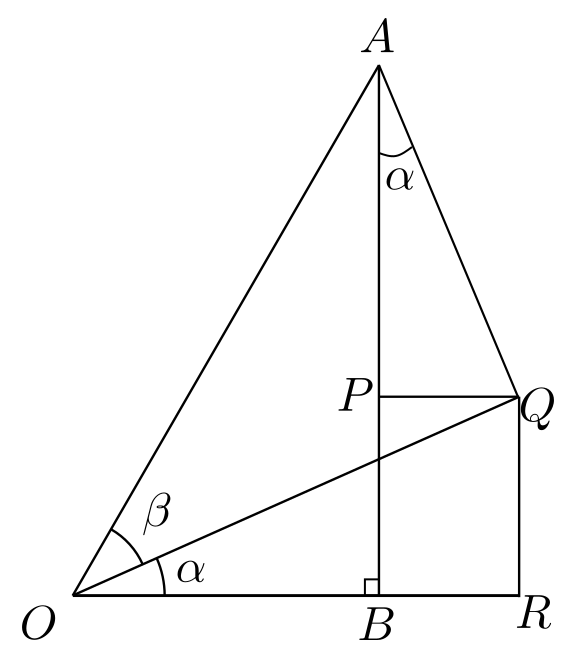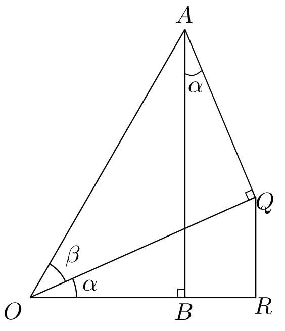 במשולש החדש הזה מתקיים \(\frac{\left|RQ\right|}{\left|OQ\right|}=\sin\alpha\) פשוט על פי הגדרת סינוס. לכן, אם נשתמש ב-\(\left|OQ\right|=\cos\beta\), נקבל \(\left|RQ\right|=\sin\alpha\cos\beta\). הופה! זה דבר רציני ביותר - קיבלנו כבר את אחד משני הביטויים שמשתתפים בסכום הסופי, והבנו מאיפה צצה המכפלה הזו של סינוס של זווית אחת בקוסינוס של הזווית השניה. אבל איך אפשר לקשר את \(RQ\) הזה שהוא קטע חדש שהוספנו משום מקום, אל מה שאנחנו רוצים לחשב, שהוא כזכור האורך של \(AB\)? ובכן, אפשר להיעזר בכך שגם \(AB\) וגם \(RQ\) שניהם מאונכים מ-\(OR\) כדי לבנות מלבן שמערב אותם: