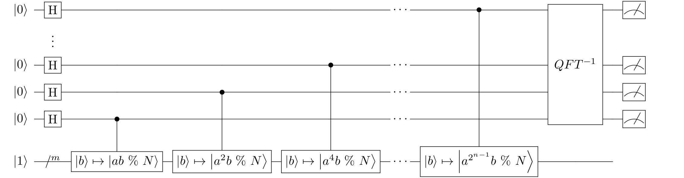 \(U\left|b\right\rangle =\left|ab\text{ mod }N\right\rangle \)