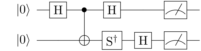 הנה למשל מעגל טומוגרפיה על שני קיוביטים שקודם כל מייצר את המצב השזור \(\frac{\left|00\right\rangle +\left|11\right\rangle }{\sqrt{2}}\) (או, אם לחדד את הפואנטה מאחורי טומוגרפיה קוונטית, קודם מנסה ליצור את המצב הזה, ומטרת הטומוגרפיה היא לראות כמה הוא הצליח בזה) ולאחר מכן מודד את הקיוביט הראשון בבסיס \(X\) ואת השני בבסיס \(Y\):