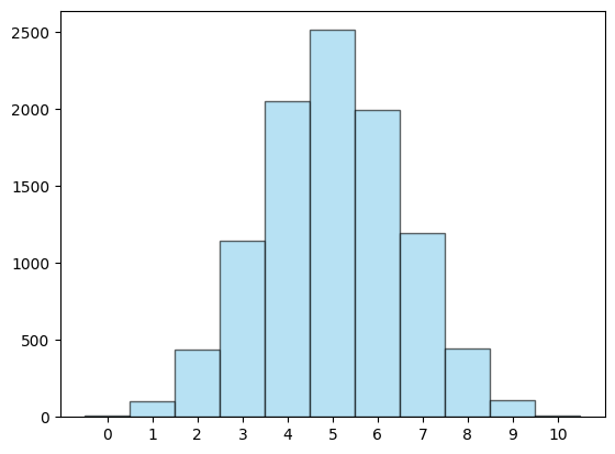 הטלה אחת זה נחמד, אבל מה נקבל אם נטיל את המטבע עשר פעמים ונספור כמה פעמים קיבלנו עץ? כאמור, אפשר היה לקוות שבדיוק ב-5 מהפעמים ייצא עץ וב-5 מהפעמים ייצא פלי, וזה באמת יכול לקרות אבל זה לא חייב לקרות. המציאות לא עובדת ככה. ייתכן שהמטבע ייפול על "עץ" בכל הפעמים, אם כי זה לא סביר, וייתכן שהוא ייפול 6 פעמים על עץ ו-4 על פלי. אז כדי לעשות סדר בבלאגן הזה ולחפש ודאות שכן קיימת, אנחנו משחקים את המשחק הזה של "בואו נטיל מטבע 10 פעמים" הרבה פעמים ובודקים מה התוצאות הכי נפוצות. למשל, אני יכול לבקש מהמחשב לשחק את המשחק הזה 10,000 פעמים, ואז לצייר את מה שנקרא היסטוגרמה - איור שבו הנתונים מוצגים בצורה שקל להבין אותם: