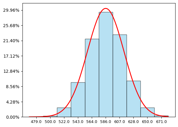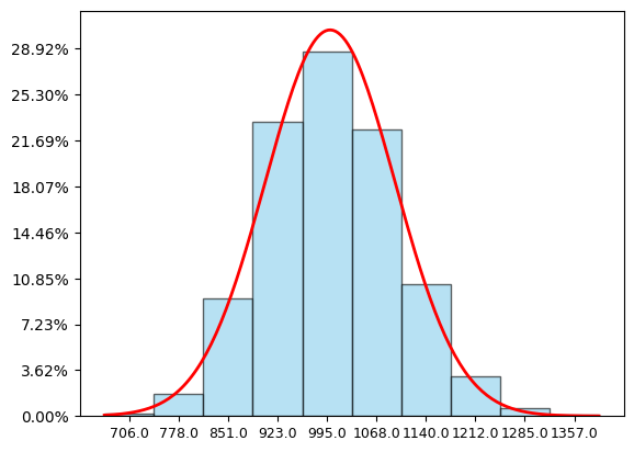 עכשיו, הציור הזה נראה טוב. למעשה, הוא נראה טוב מדי. אני צריך להישבע שלא בישלתי אותו בשום צורה כי אפילו אני לא ציפיתי שזה ייצא עד כדי כך טוב בדוגמא האקראית שיצרתי. הקו האדום מצליח איכשהו לעבור דרך הפסים כך שהוא מגיע לגובה של כל פס תוך שהוא עובר כמעט בדיוק דרך נקודת האמצע שלו. עכשיו, אפשר לומר שלא ברור מה מרשים פה - הרי בסך הכל לקחתי את הפסים, מצאתי את נקודות האמצע של כל פס ואת הגובה, זרקתי את כל המידע הזה לסקריפט שלי ואמרתי לו "יאללה, תחשב עקומה" - לא? ובכן, ממש לא. הקוד שצייר את הקו האדום לא ידע כלום על הפסים וכלום על התוצאות ההסתברותיות הקונקרטיות שקיבלתי. הוא ידע רק שני מספרים שמאפיינים את ההתפלגות הבינומית הזו - התוחלת של ההסתברות וסטיית התקן שלה, ושניהם הם מספרים שלא מחושבים מתוך ההיסטוגרמה עצמה (כלומר, מתוך התוצאות הקונקרטיות שקיבלתי שמתוארות על ידי הפסים) אלא באופן תיאורטי, מתוך התכונות הבסיסיות של ההתפלגות. שני המספרים הממשיים הללו הם כל מה שצריך כדי לקבל עקומה שמקרבת בדיוק מופלא את ההתנהגות של ההתפלגות הבינומית.