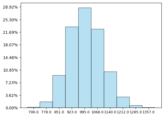 זה... קצת מזכיר את הגרף שראינו קודם, של ההתפלגות הבינומית. מה הולך כאן? המספרים שכתובים למטה נראים גבוהים מדי. הרי "1" הוא בהסתברות הכי גבוהה, ואני בסך הכל מאגד 100 היסטוגרמות ביחד. זה לא אמור לצאת קרוב אל 100? ובכן, לא. בלי להיכנס עדיין למונחים הטכניים הרלוונטיים, הערך ה"ממוצע" שאפשר לצפות לו בהתפלגות הגאומטרית של משחק הסלים שלי הוא 10. כי אמנם השטח של הפסים הראשונים נראה גדול ומרשים אבל הוא לא מה שאנחנו מודדים - ה"ממוצע" הוא סכום המכפלות של הגבהים של הפסים בערך המספרי שהם מייצגים. הגובה של הפס של 1 הוא בערך \(\frac{10}{100}\)? אנחנו כופלים אותו בערך המספרי 1. הגובה של פס 2 הוא בערך \(\frac{9}{100}\)? אנחנו כופלים אותו ב-2 ומקבלים \(\frac{18}{100}\). כך אנחנו עושים לכל ערך אפשרי - כופלים אותו בהסתברות שהוא יתקבל, סוכמים, ומגלים שדווקא ה"זנב" שבכלל לא רואים בהיסטוגרמה תורם חלקים נכבדים לממוצע. אז אם הממוצע הוא 10 למשחק, ויש 100 משחקים, לא מפתיע שהסכום הכולל הוא בסביבות 1000; ככל שמשחקים יותר משחקים כך התוצאות מסתדרות יפה סביב הממוצע.