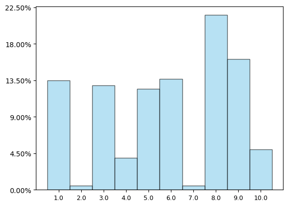 בואו נראה עוד דוגמא. נניח שאני מטיל קוביה עם עשר פאות, כלומר מקבל תוצאה בין 1 ל-10, אבל הקוביה הזו היא לא הוגנת אלא מוטה בשלל דרכים שונות ומשונות שהופכות תוצאות מסוימות ליותר נפוצות ותוצאות אחרות לנדירות. הנה היסטוגרמה של 10,000 הטלות של הקוביה הזו: