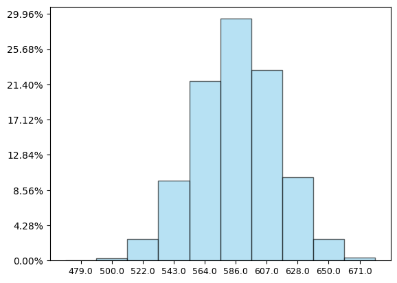 עכשיו בואו נטיל את הקוביה הזו מאה פעמים ונחבר את התוצאות ונראה מה קיבלנו. נחזור על הניסוי הזה 10,000 פעם, ונקבל את ההיסטוגרמה: