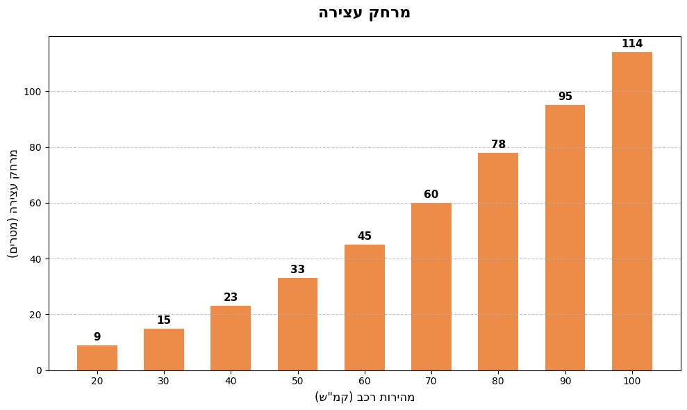 מרחק עצירה הוא המרחק שרכב עובר במקרה של בלימת פתע, החל מהרגע שבו הנהג מזהה את הסכנה שמצריכה בלימת פתע ועד שהרכב עוצר בפועל. זה כולל את המרחק שהרכב עובר בזמן שלוקח לנהג להתחיל לבלום, ואת המרחק שהוא עובר בזמן שהרכב מאט עד לעצירה מוחלטת. מן הסתם המרחק הזה מושפע משלל גורמים, החל במהירות התגובה של הנהג וכלה באיכות הבלמים של הרכב. לכן מלכתחילה הנתון הזה הוא לא איזו אמת מתמטית אבסולוטית שנחתה עלינו משמיים אלא הערכה בלבד, שהדרך הנכונה לאסוף אותה היא לבחון אותה בשטח ולקחת... ממוצע? עזבו, אני אפילו לא בטוח שזו הדרך הנכונה לאמוד אותה. אני כאמור נקטתי בשיטה הלא כל כך אמינה "לגגל באקראי באינטרנט כי אני בסך הכל רוצה מספרים לעבוד איתם".